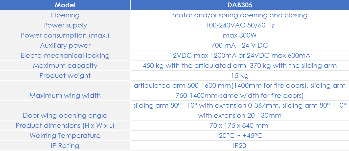 The DAB305 auto swing door system is an innovative and powerful gear motor capable of guaranteeing an excellent performance with up to 450 kg door weight.